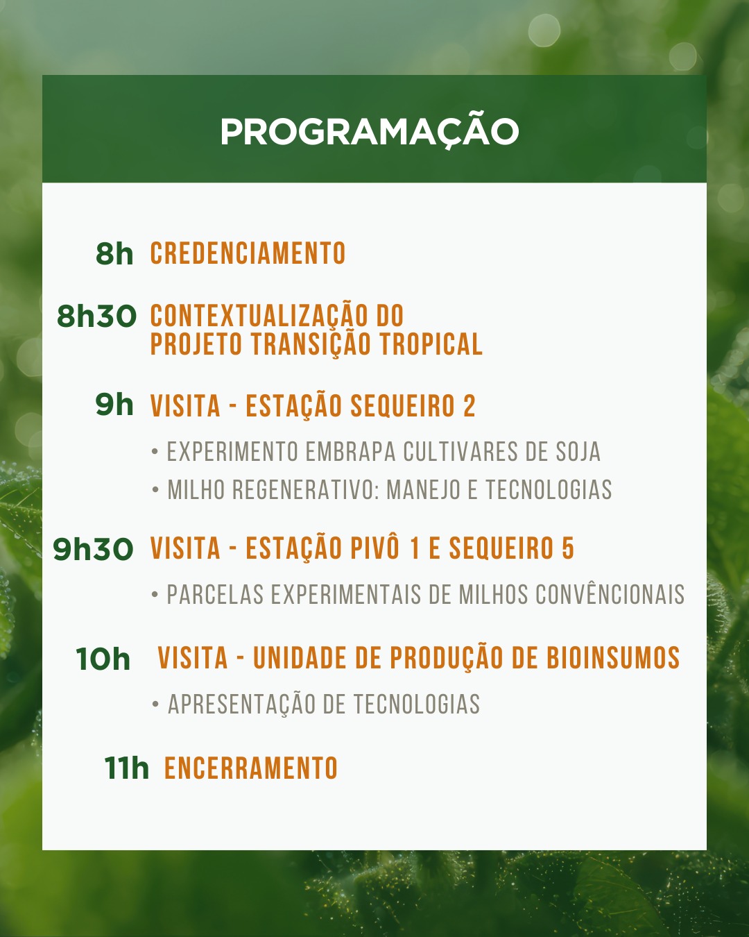 A programação tem início às 8 horas, com credenciamento dos participantes. Em seguida, às 8h30, será realizada uma contextualização do Projeto Transição Tropical. A partir das 9 horas, estão previstas visitas técnicas à Estação Sequeiro 2, onde serão apresentados experimentos conduzidos em parceria com a Embrapa sobre cultivares de soja, além de práticas de manejo e tecnologias voltadas ao cultivo de milho regenerativo. Às 9h30, a visita segue para as áreas experimentais das estações Pivô 1 e Sequeiro 5, com apresentação de parcelas de milho convencional. Às 10 horas, os participantes conhecerão a Unidade de Produção de Bioinsumos, onde serão demonstradas tecnologias utilizadas no processo produtivo. O encerramento está previsto para as 11 horas.