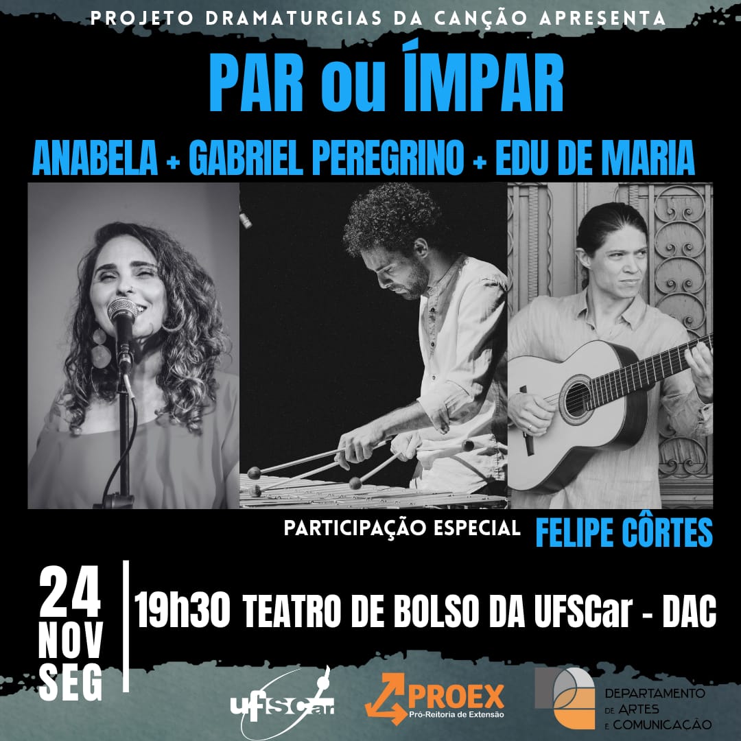 O show "Par ou Ímpar" é um duo formado pela cantora Anabela e por Eduardo Conegundes (Edu de Maria), professor do Departamento de Artes e Comunicação (DAC). Junto com eles, estará Gabriel Peregrino, percussionista, pesquisador da Unicamp e músico da Orquestra Sinfônica de Campinas.